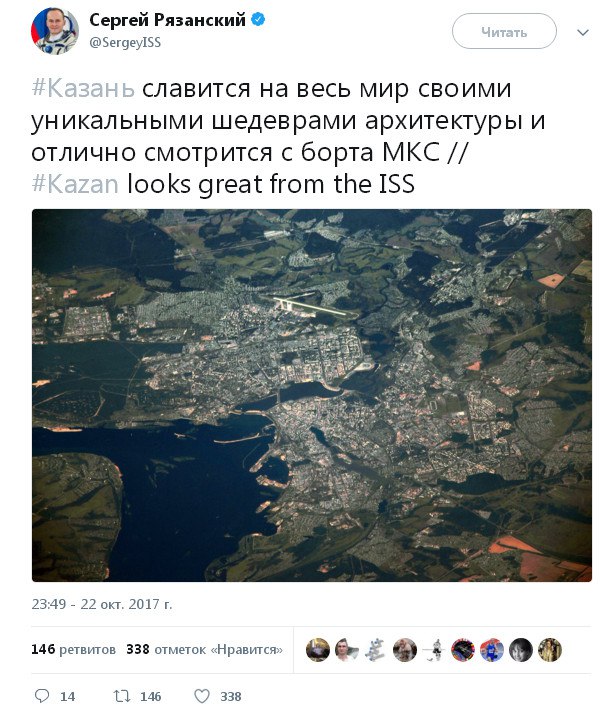 «Казань славится на весь мир своими уникальными шедеврами архитектуры и отлично смотрится с борта МКС», - подписал автор снимка.