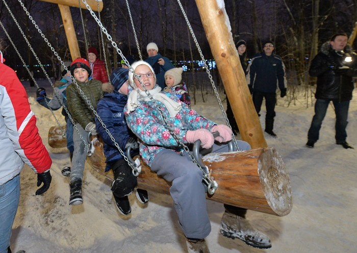 К слову, для активных и юных духом здесь организован прокат лыж, есть трехкилометровая лыжня с подсветкой, кафе и звучит бодрая музыка. Судя по имеющейся сцене, в праздничные дни тут будут проходить разные концерты.