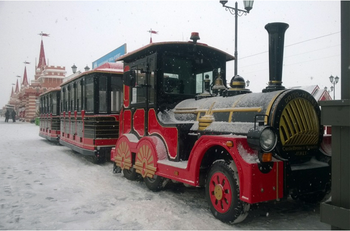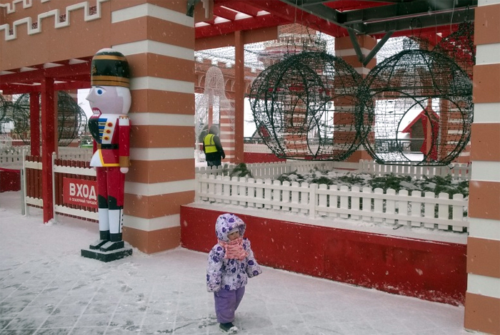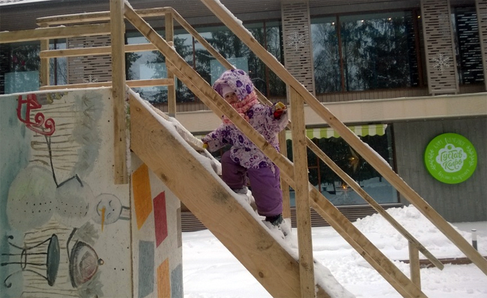 Возле «Густав кафо» нашли деревянную горку с металлическим настилом, вполне пригодную для катания на салазках. Вообще, ледянки и тюбинги в местах массовых развлечений пригождаются гораздо чаще олдскульных санок на полозьях.