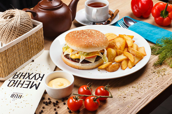 Из еды можно было бы заказать пиццу, потому что в «HUB» она довольно вкусная. Но в одиночку вы ее не осилите (Хотя, кто знает ваши аппетиты). Предлагаю выбирать из моего любимого набора «бургер, паста или салат». Самые голодные могут комбинировать всё сразу. В зимнюю пора в качестве напитка выбирайте один из горячих витаминных коктейлей – вкусно, тепло, полезно!