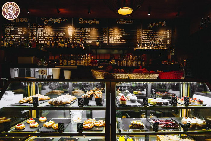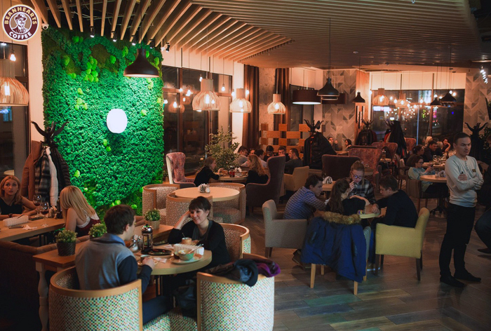 Интерьер в приятных теплых тонах, улыбчивые официанты, красивые пироженки на прилавке при входе и умиротворяющая зеленая стена, сделанная под весеннюю траву.
