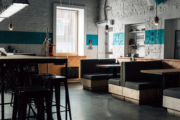 Отличное место для тех, кто за ужином хочет посмотреть фильм или закончить дела, потому что практически около каждого стола есть розетки – можно смело приносить с собой ноутбук. В центре зала есть более высокий по сравнению с остальными стол, за который можно сесть на барный стул. Так, вы даже будучи один, не останетесь без внимания.