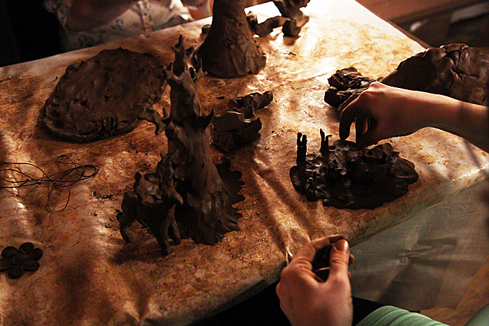 В итоге, большинство из нас оставили попытки сделать всё красиво и как надо, и мы просто дали волю рукам. Возле деревьев появились ручьи и прудики, на берегах поселились лось, утки, выросли камыши. Мы придумали истории о том, где растут наши деревья, кто живёт в их кронах и поблизости. Построили дорожки, заборы, украсили пространство цветами и плодами.