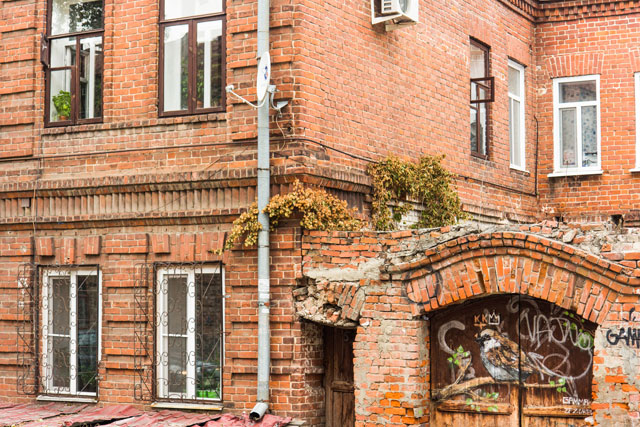 Поднимаюсь по улице Галактионова и попутно вспоминаю дорогу. Идти ещё прилично, а я категорически забыла маршрут. В двух шагах от Дома Кекина делаю остановку, чтобы сделать фото: на деревянных воротах жилого дома давно живёт граффити с птичкой. Коммунальщики не закрашивают, это хорошо.
