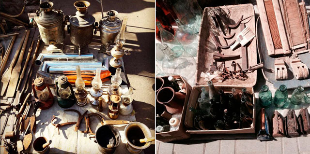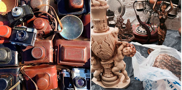 Среди развалов с хламом из 90-х, сломанными очками, вытянутыми свитерами и картриджами для «Dendy» я пытаюсь найти что-то ценное/интересное для себя. В рядах «блошки», которые ближе к дороге, много кинореквизита вроде посуды и санок. Здесь встречаются вещицы из 40-х годов, украшения и музыкальные инструменты.