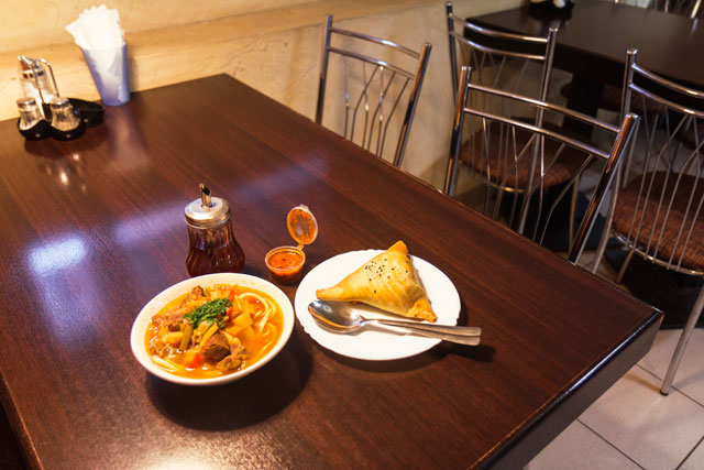 По совету друзей я взяла мисочку обжигающей шурпы, отдельно к ней свежую аджику и половину узбекской лепешки, которую пекут тут же. Я люблю насыщенную восточную кухню. Пожалуй, этот супчик с острой аджикой и красным уксусом – лучшее лекарство от похмелья, но на мой вкус мяса в суп положили слишком много. Среди прочего в меню – обычные для столовой горячие блюда из мяса или рыбы под сыром, а местное культовое блюдо – это мясо по-чешски (почему?), судя по скорости выставляемых на раздачу тарелок с горой мяса и толстым слоем майонеза.