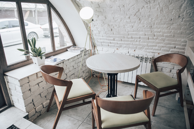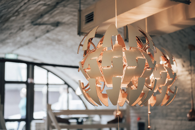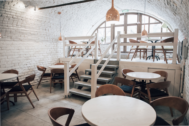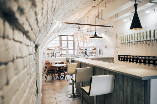 Дизайн бара продолжает скандинавскую концепцию прошлого помещения — белые кирпичные стены и свод, яркие акценты, много солнечного света и светильники оттенка «розовое золото», которые сейчас являются трендом.