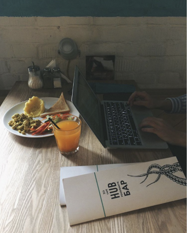 Меню «Хаба» включает в себя как бизнес-ланчи, так и самостоятельные позиции: супы, бургеры, пасты и многие другие блюда. Единственный минус заведения — обслуживание. Иногда приходится по 15 минут ждать, чтобы официант элементарно принёс меню или счёт. Что касается всего остального — вполне приемлемо. Светлое помещение с минималистичным и стильным дизайном, наличие множества розеток (что очень важно для того, кто выбирает это кафе в качестве рабочего пространства), демократичные цены и удачное расположение — всё это делает «Хаб» таким, какой он есть.