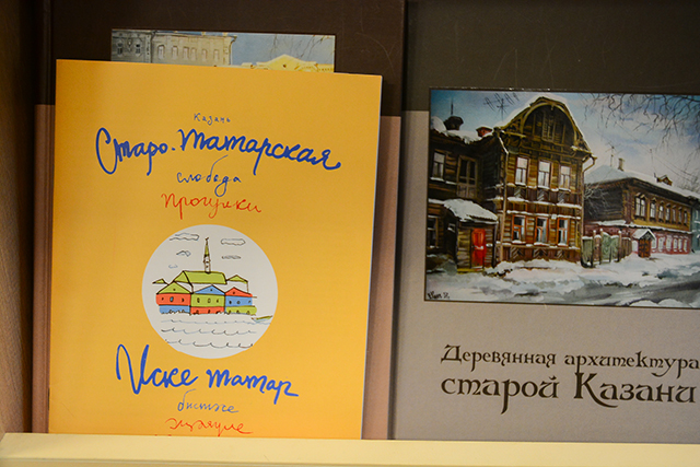 Одни и те же книги на двух языках: на татарском и на русском. Есть, например, мои любимые «Неотосланные письма» Аделя Кутуя, есть книги про Казанский Государственный университет (ныне КФУ), книги по истории и архитектуре Татарстана, симпатичные открытки с надписями на татарском языке и многое другое.