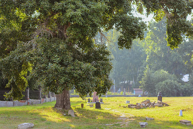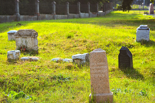 Вернувшись к исходной точке, мы взяли правее и вскоре вышли к Александровскому саду. На подходе к нему моё внимание украл старинный забор, за запертыми воротами которого притаилось старинное кладбище. Табличка на входе гласила, что здесь похоронены многие деятели Елабуги, а объект находится под защитой. Долго я убеждала себя, что калитка приоткрыта, и никто не будет против моего самоличного входа. Но всё же у меня мелькнула мысль, что некоторые места лучше не тревожить. И это одно из них.