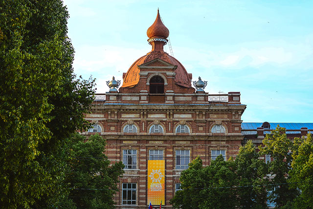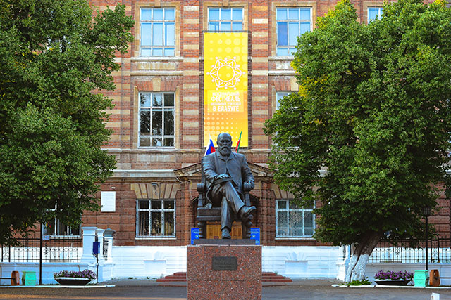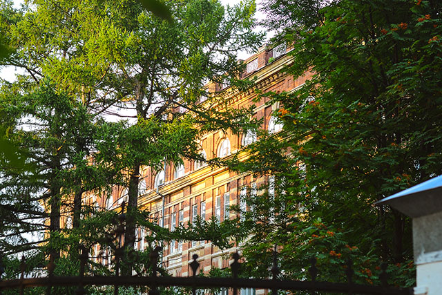 Мы держим путь к последней важной точке нашей поездки – зданию КФУ, в прошлом педагогического университета. Впечатляющее здание из красного кирпича прячется за изогнутым забором, который его украшает. Прячется за зеленью деревьев, которые отражаются и мелькают в окнах. Прячется за яркий баннер на фасаде, который не несёт в себе хоть сколько-нибудь полезной информации о здании. При беглом взгляде здание напоминает Хогвартс. Увы, внутри, по словам студентов, скучно.