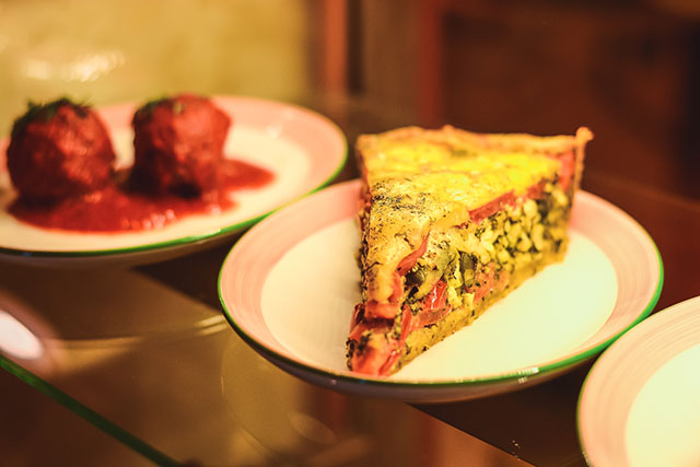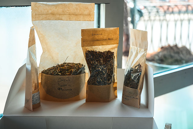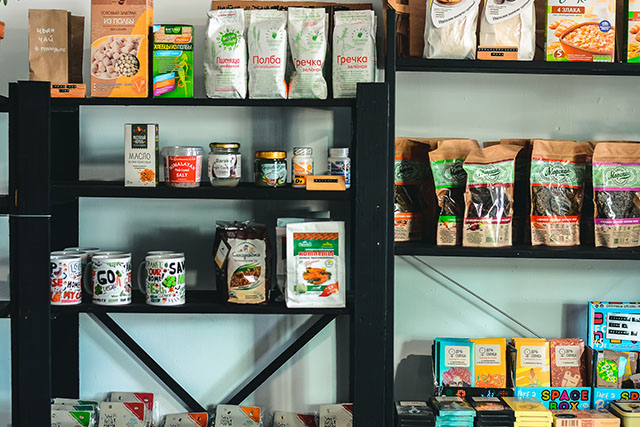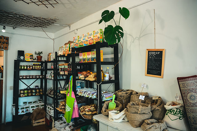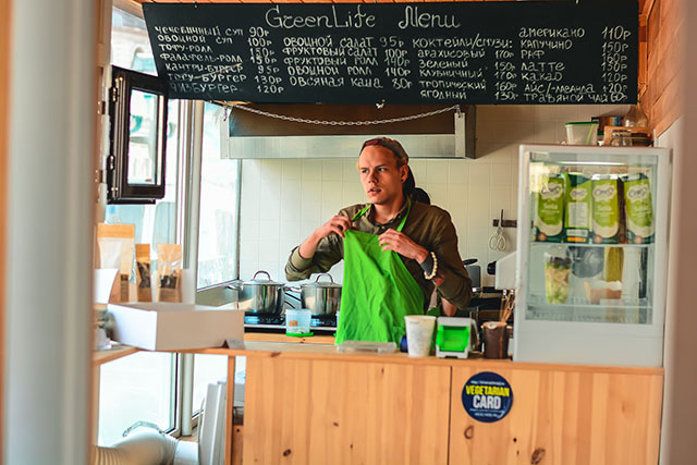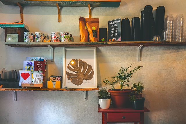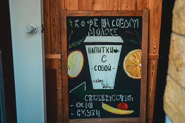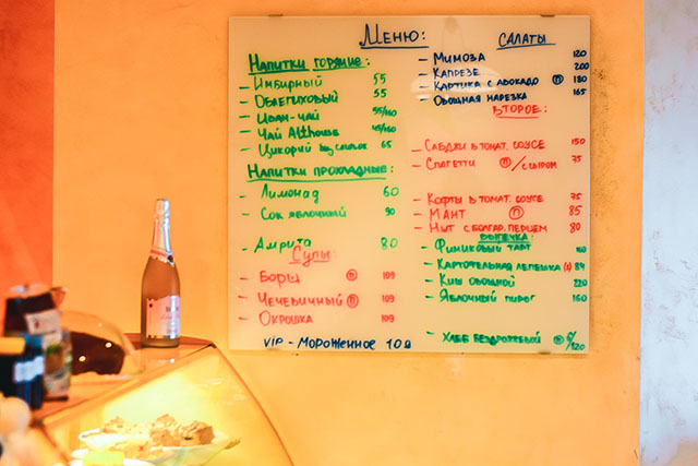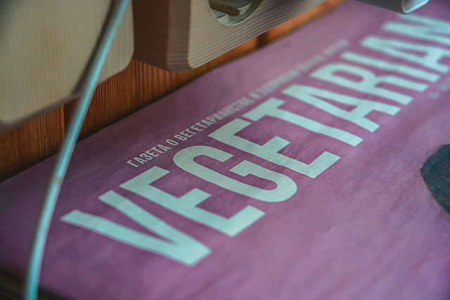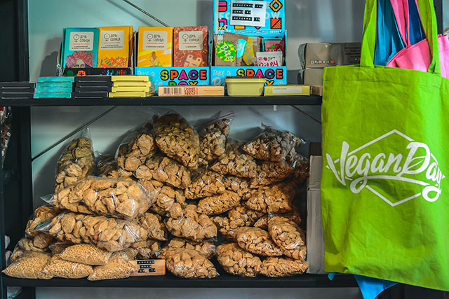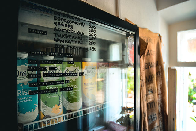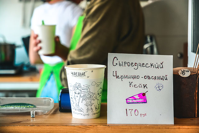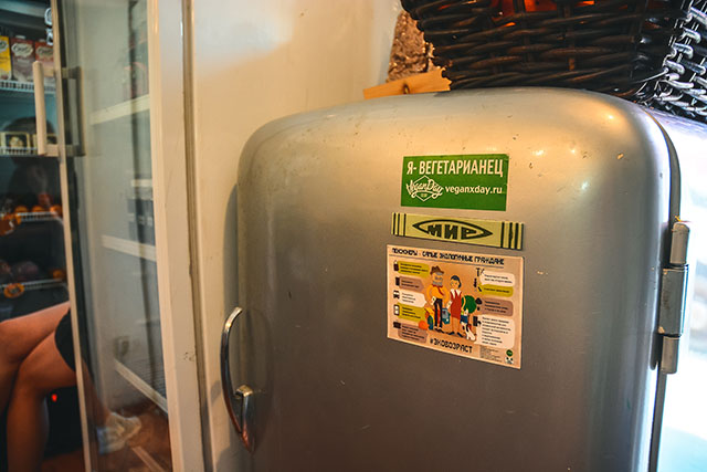 Как только я перешагиваю порог, то вижу стойку, за которой готовится еда и варится кофе у соседей «Vegan Day», кофейни «Диван». Слева находится витрина с открытками, книгами, значками, кружками, а справа – холодильник, в котором можно найти тофу, растительное молоко, веганские колбасу и сыр.