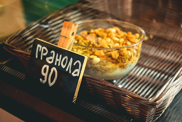 Популярные позиции в меню – ролл с «рыбной» котлетой из тофу и листьев нори, фалафель, чизбургер с веганским сыром, кантри-бургер с соевым фаршем. Ещё недавно появились овсяные каши, мороженое, кексы и пироги. Из напитков – кофе и какао на соевом молоке и различные смузи. Мой любимый – арахисовый. Очень сытный, перед учёбой – самое то.