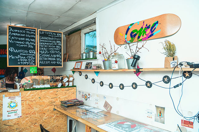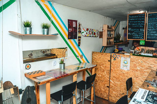 Несмотря на то, что кафе само по себе очень маленькое, найти там можно не только еду, но и одежду российского скейт-бренда «Giko». А ещё в нём можно взять лонгборд на прокат.