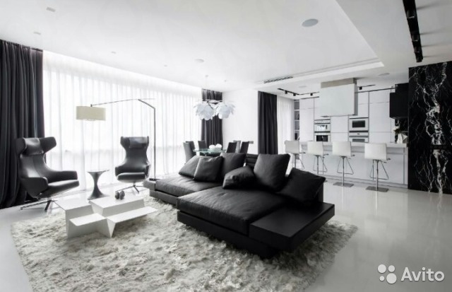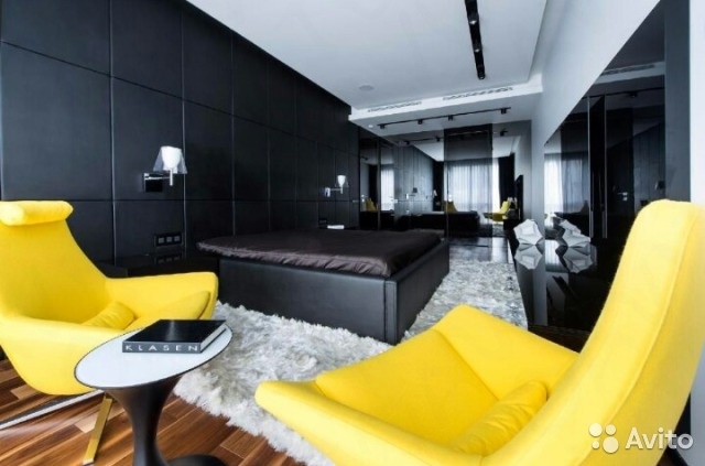 Чёрно-белая квартира всего с одним акцентом яркого цвета – два жёлтых кресла. Главный стиль квартиры – минимализм (и перфекционизм): стулья возле барной стойки стоят в аккуратном ряду, все книги с чёрно-белыми обложками. Кажется, что даже ворсинки на ковре «зачёсаны» в одну сторону. Чувствуется влияние дорогостоящей «Икеи» и шведских правил жизни. Да, домашняя библиотека из pocket book сюда никак не вписывается, придётся соответствовать квартире, покупать ч/б книжки и ходить в ч/б одежде. Вот такая монохромная жизнь.