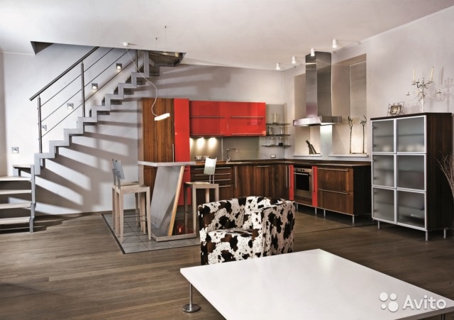 Зал этой квартиры отлично подойдёт для важных совещаний или просмотра хоккея с друзьями – по трём сторонам комнаты стоят диваны и кресла, а посередине – огромный шкаф-стенка с маленьким телевизором, похожим больше на планшет. Игру вы, конечно, не увидите, но полюбуетесь лицом рядом сидящего друга.