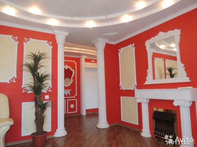 Если бы белокаменный зал в ГМИИ РТ (здание усадьбы Сандецкого) стал квартирой, то выглядел бы он именно так. Красные стены, белый камин, бесконечные колонны, которые стоят где только можно. От такого однообразия цветов можно устать, но на этот случай в квартире есть ещё одна комната, которую пытались сделать помпезной, но, кажется, колонн не хватило.