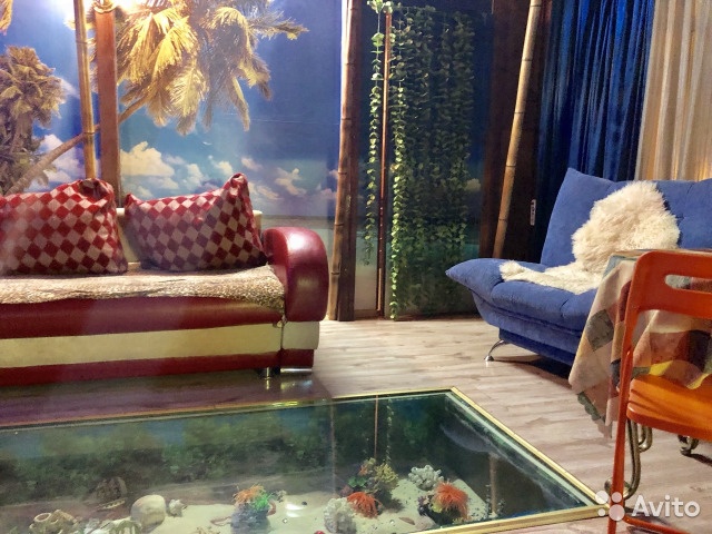 В холодный декабрь так хочется погреться в тёплой стране, но бюджет не позволяет. Можно потратить всего 2000 р. и, не выезжая из Казани, почувствовать атмосферу курорта, просто сняв эту квартиру. Можно будет валяться рядом с фотообоями с пальмами, а под ногами вместо пола будет маленький искусственный аквариум. Чуть левее вы попадёте на свою летнюю дачу, где стоит маленький круглый столик, складные стулья и бабушкин диван. Чуть правее вы уже живёте в номере люкс-отеля «Марриотт». Здесь вам и камин, и мини-фреска Микеланджело «Сотворение Адама», и столик из кованого железа. В этой квартире можно почувствовать реальное тепло курортных стран – просто зайдите в маленькую сауну 4х4.