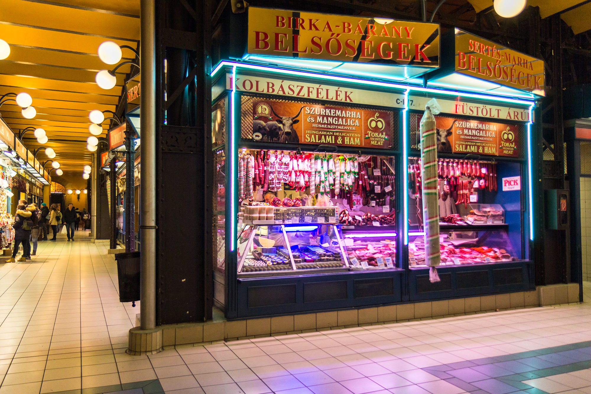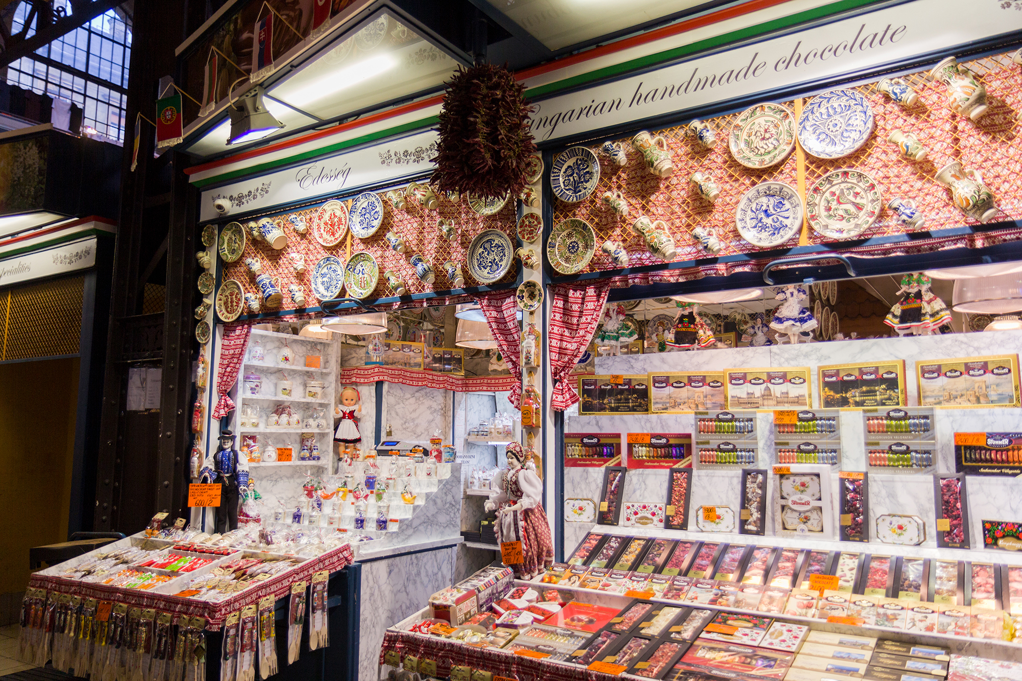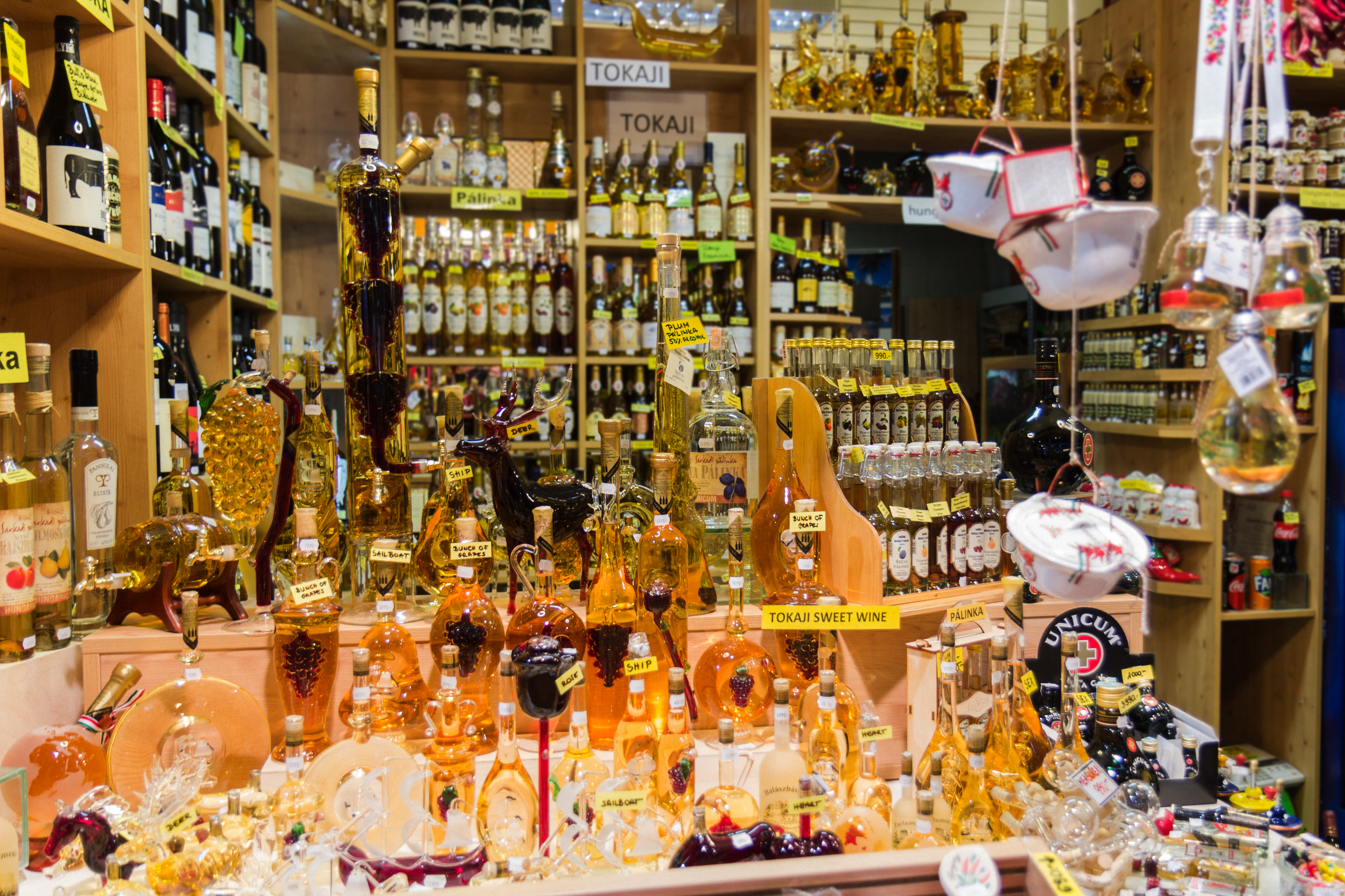 На этом рынке удобно закупиться сразу всеми сувенирами – в одном месте собраны все возможные гастрономические хунгарикумы: паприка, токайское вино и красное вино из Эгера «Бычья кровь» (Egri Bikaver), Палинка (Pálinka), салями Pick и торт Добош, травяной ликёр Unicum тоже здесь.