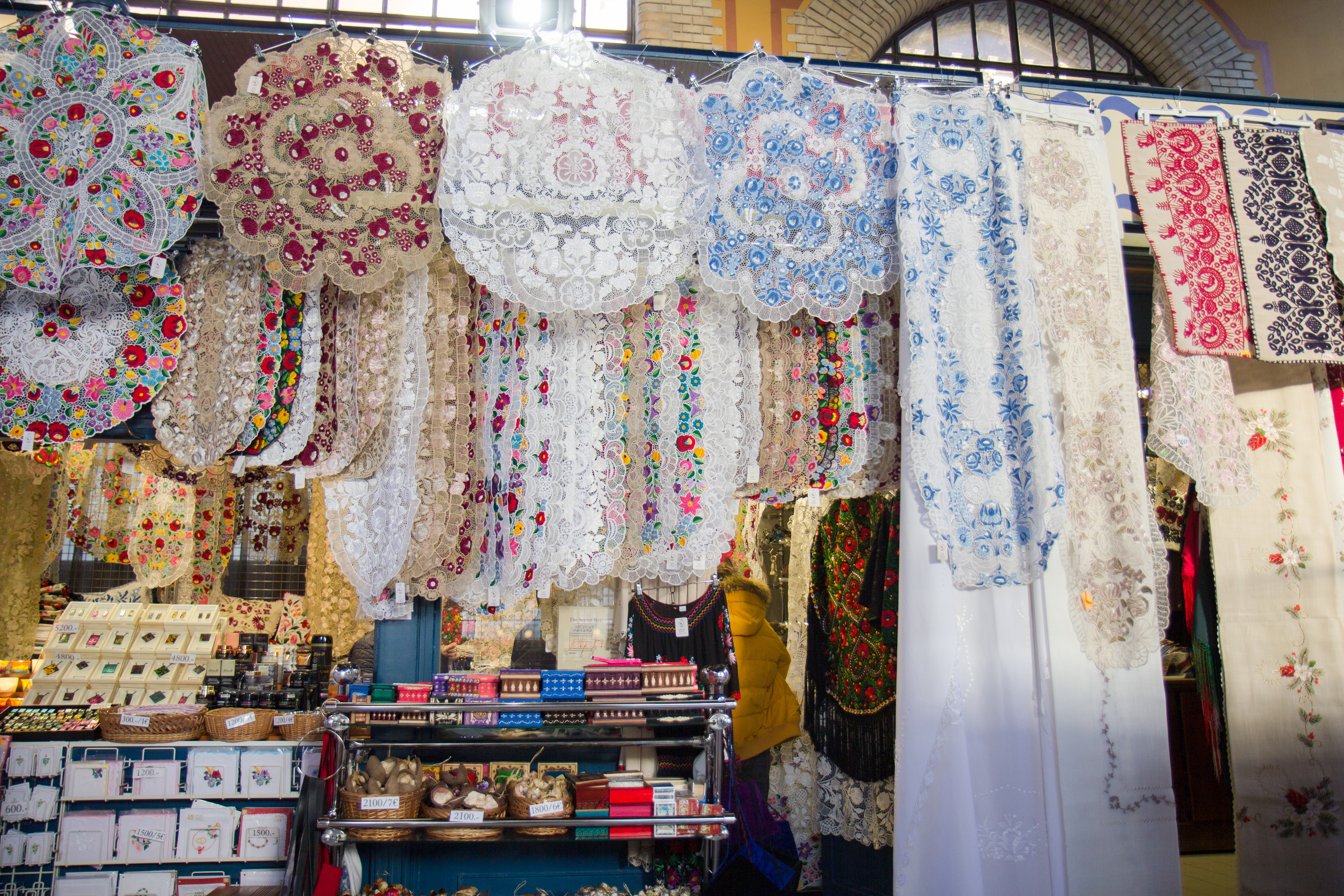 На втором этаже сувениры и предметы ручного труда, от кубика-рубика и магнитиков до гордости венгерских женщин – кружев и скатертей, которые есть у каждой советской хозяйки образца 80-х.