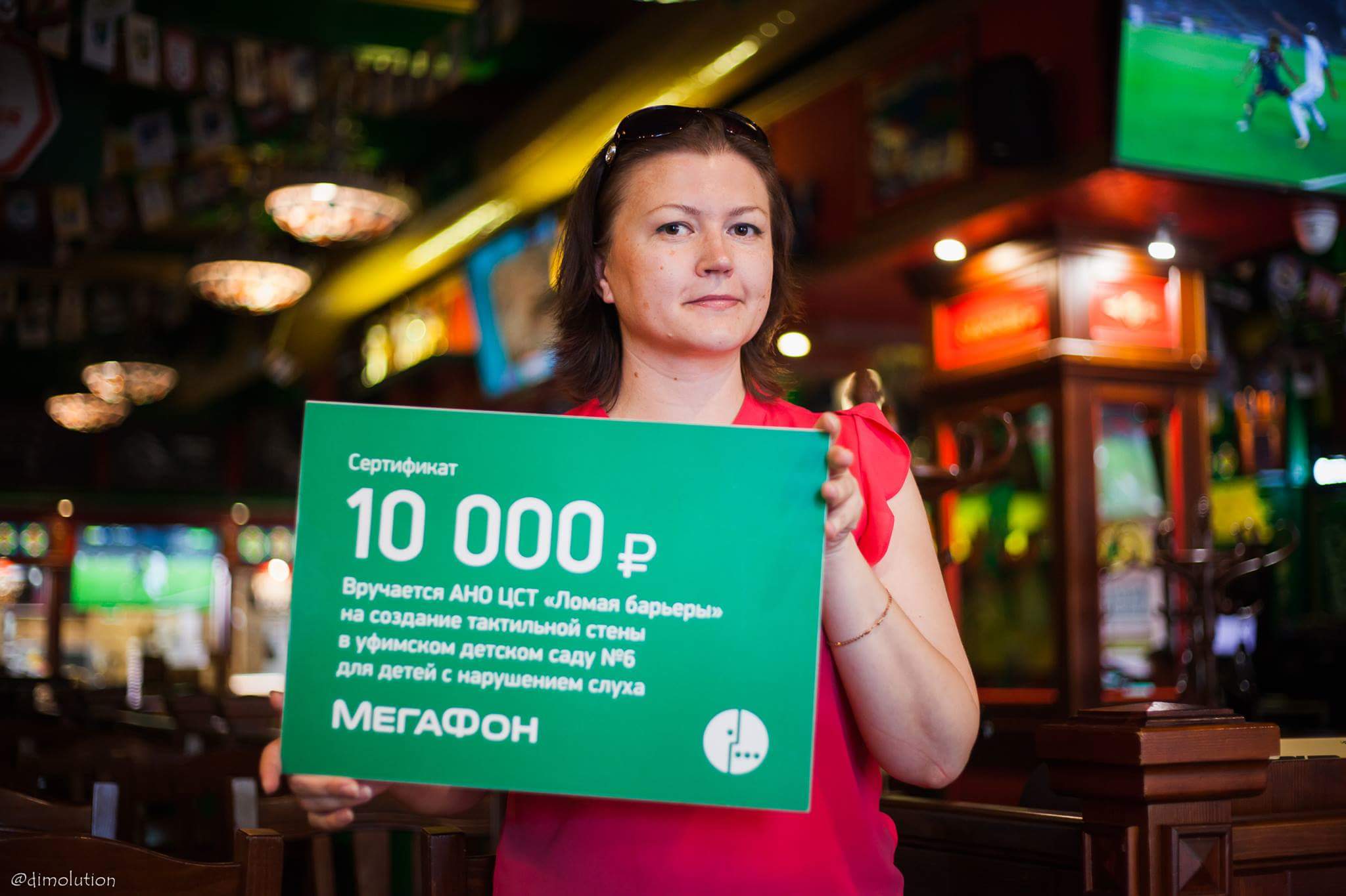 Сертификат на реализацию благотворительного проекта номиналом 10 тысяч рублей получила лично в руки руководитель Центра социальных технологий «Ломая барьеры» Алина Хабирова. «В этом детском саду- ребята с нарушениями слуха из всех уголков Башкортостана, и, конечно, хочется, чтобы им на помощь приходили самые прогрессивные образовательные технологии. Поддержка мобильного оператора, который известен своим интересом к инновациям, позволит создать тактильную стену для развития мелкой и крупной моторики, а также для тренировки артикуляционного аппарата детей», - подчеркнула Алина Хабирова.