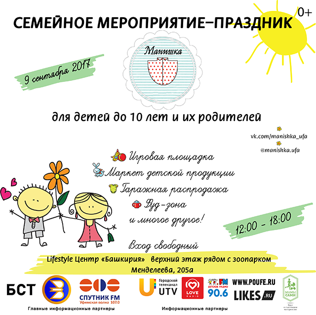 Площадка события разделится на три зоны: гастрономическая, познавательно-развлекательная и зона распродажи. В рамках последней гостей ждёт гаражная ярмарка, на которой можно купить хорошие детские вещи у уфимских мам. Гурманы смогут отведать аппетитные лакомства под вокальные и танцевальные номера лучших коллективов Уфы, а самые юные посетители «Манишки»- принять участие в увлекательных мастер-классах.