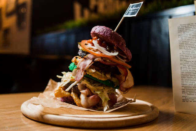 Килограмм разноцветного бургера за косарь, ребятки. Смотрим на состав, специально для вас его собирали на камеру. Во-первых, здесь только говядина, никакого баловства, и бекон на гриле. Во вторых, она подается с подтаявшим миксов сыров, сыра много. В-третьих, все это убийство разбавляется салатом, томатами, луком и маринованными огурцами. В-четвертых, здесь три булочки. Ну как, технически, полторы. В-последних, не грусти-похрусти луковыми кольцами фри.