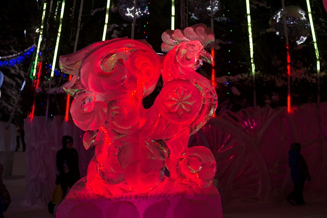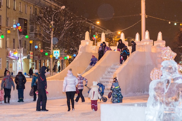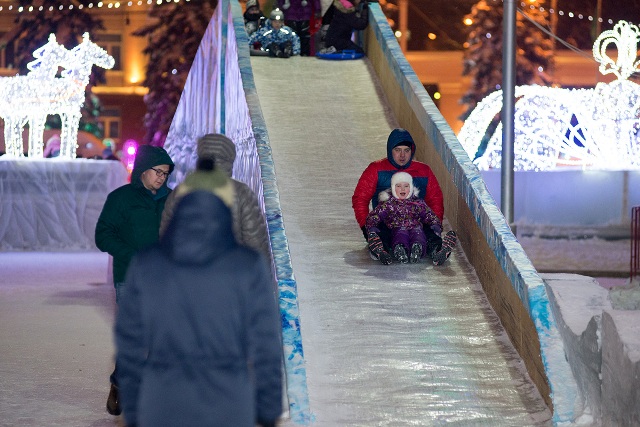 Горки так себе, хоть и сделана широкой и пологой, но залита так себе, скользит плохо. Дети приходят сюда исключительно с родителями, не спасает даже подсветка. Очень красивые резные фигуры петуха и Деда Мороза. Но монеток к ним пока еще никто не прилепил, видимо, возвращаться не очень хочется.
