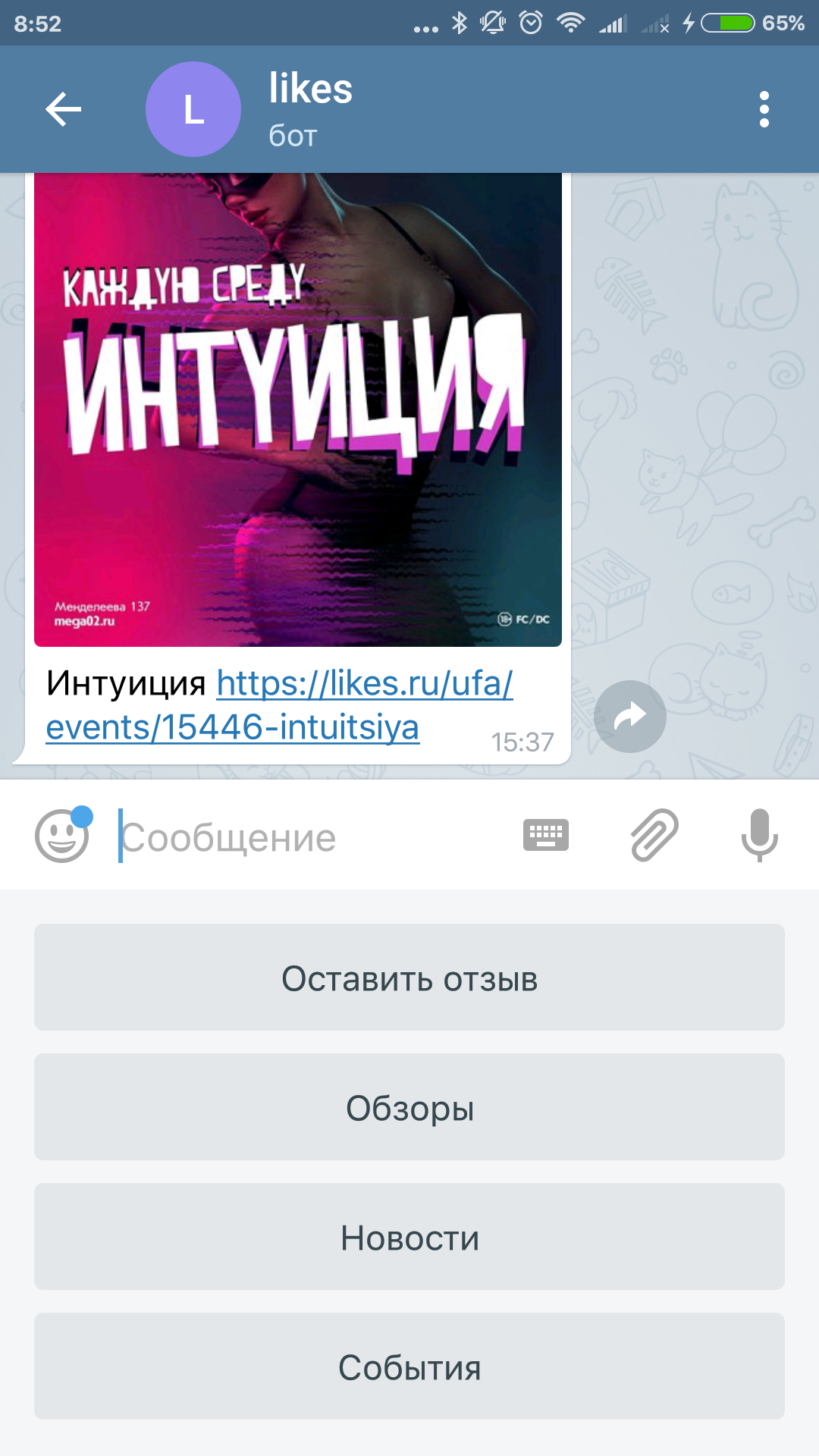 Ещё мы создали для вас телеграмм-бот, благодаря которому вы сможете почувствовать себя вершителями судеб рестораторов и самостоятельно формировать рейтинг заведений города. Как? Жмите сюда, чтобы сообщить боту о своём желании, и он легко и быстро разместит ваш отзыв на Likes.ru. Желательно прикрепить фотографии как доказательства того, что вы там были (фото еды или селфи в туалете тоже подойдут) - так ваш отзыв будет информативнее, ярче и интереснее всем читателям. Не забудьте поставить положительную или не очень оценку заведению, чтобы управлять его позицией в топе, который обновляется ежемесячно. Кроме того, бот ещё и очень умный - по запросу он выдаст только самые свежие новости и обзоры на интересную вам тему, а в дальнейшем будет совершенствовать свои умения и набираться новых. Будьте в курсе всех движух в Уфе прямо в вашем мессенджере!