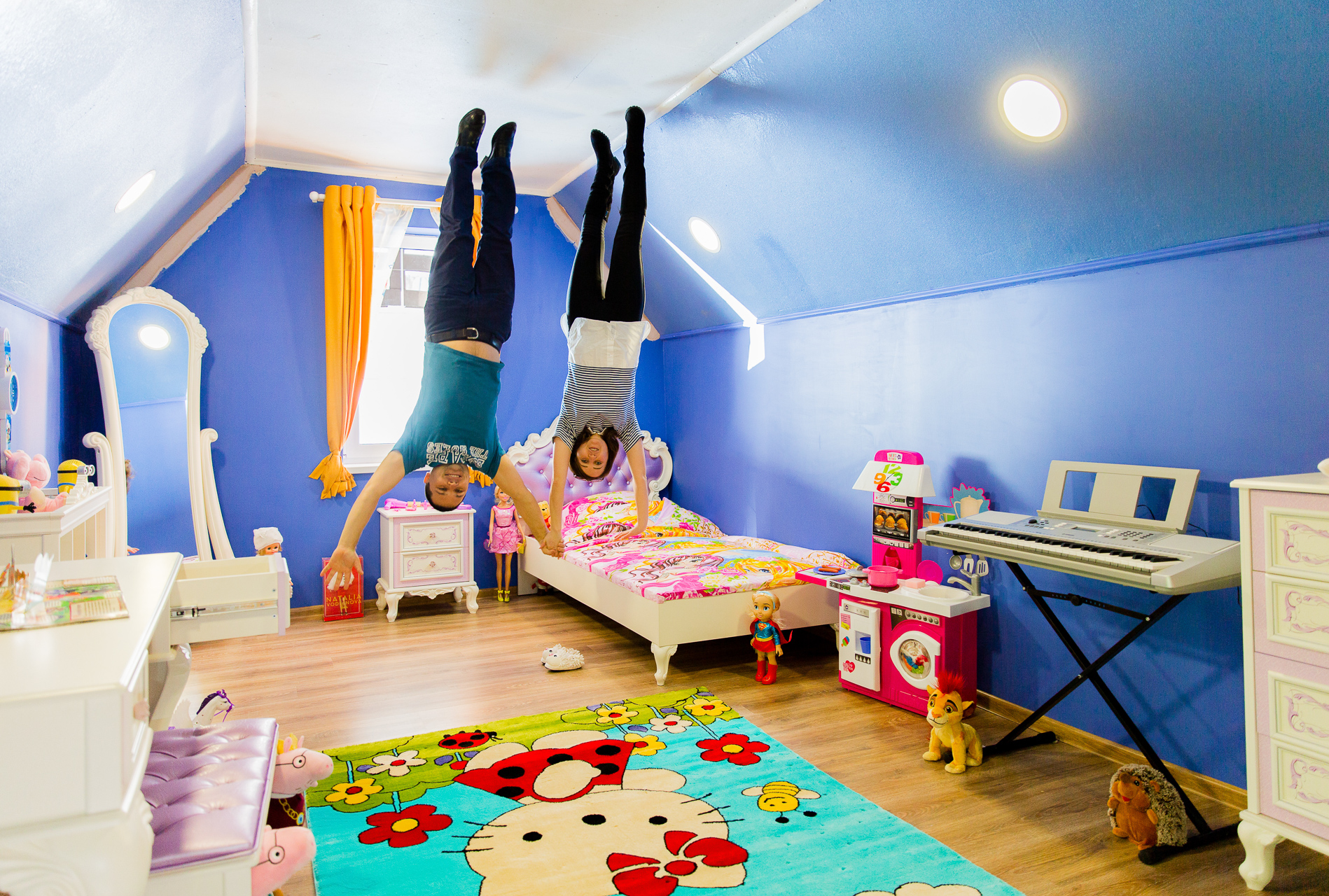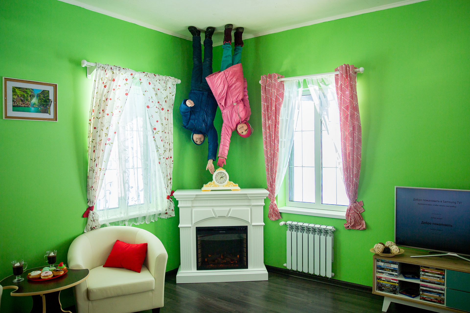 На территории почти 350 квадратных метров расположились привычные комнаты: спальня, гостиная, уборная, кухня, только абсолютно все предметы интерьера в них перевернулись с ног на голову. Потолок с люстрой посередине стал полом, а внутреннее убранство буквально парит в воздухе. Даже продукты в холодильнике и начатая партия покера на столике не падает на головы изумленных гостей. Особое впечатление производит припаркованный рядом автомобиль Лифан, который купили специально для этого проекта, облегчили и покрасили в жёлтый цвет.