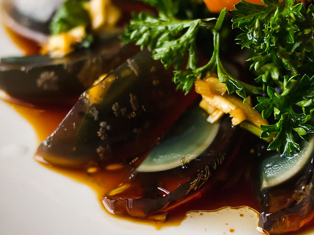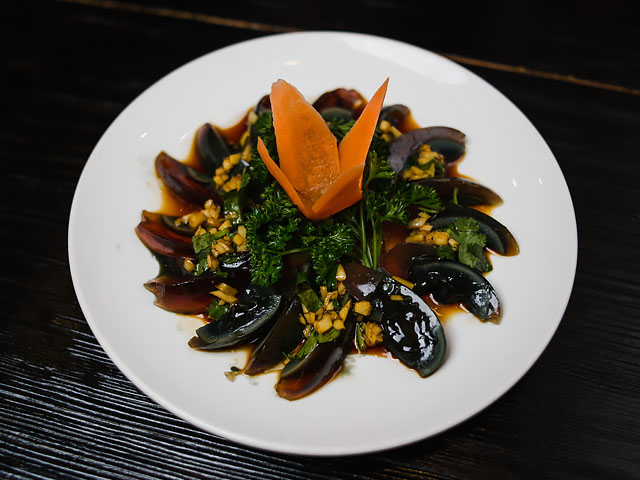 Первое, что нам принесли из меню – салат с тысячелетним яйцом. Говорят, для китайцев это как бутерброд с колбасой и сыром. Это солёное утиное яйцо, соевый соус, кунжутное и луковое масло. С невинным декором из сырой морковки и свежей зелени. Вид, конечно, пугает немного. Так как желток цвета сырой земли, а белок – как прозрачное коричневое желе. Получается оно таким после нескольких месяцев выдержки в специальной смеси без доступа воздуха. Вот приедут к вам друзья из Китая, теперь знаете, куда вести их есть тысячелетние яйца. На момент первого блюда я была очень голодной. Возможно, поэтому мне показалось, что это действительно вкусно. Как минимум, специфично и сладковато. И всего-то 390 р.