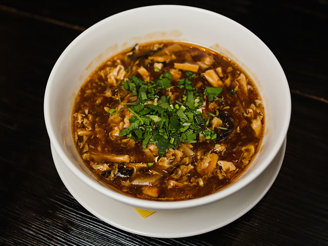 Остро-кислый суп очень хорош! Вот супы у китайцев неплохие! Насыщенные, там много всего, не разберёшь, что ешь – много приправ. Очень многогранный вкус – от кислого к острому, с курицей, яйцами (обычными, не тысячелетними и не бычьими), чёрными грибами, томатами и зеленью. Кстати, китайцы добавляют зелень во всё – набор из петрушки и кинзы сопровождает почти каждое блюдо. Этот суп похож на борщ с курицей, но вкус нежнее и острее. Для наших морозов отличное спасение и, мне кажется, эффективная профилактика гриппа. За большую тарелку, наполненную до краёв – 330 р.