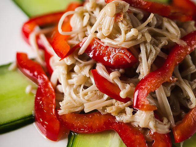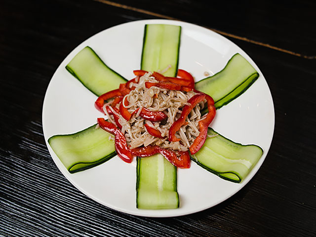 Золотые нити – это самое безобидное из моего китайского Must Eat! Это такие нитеобразные грибы Еноки, которые китайцы используют и в медицине, и на кухне. Там очень много селена, поэтому это шикарный антиоксидант! Если ощущаете нехватку клетчатки, дефицит витаминов группы В, кальция, железа и калия, сходите в «Индокитай» и съешьте порцию Золотых нитей. На вкус немного резиновые, нет ярко выраженного вкуса грибов. Всего-то 230 р.