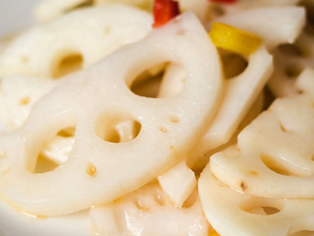 Снять стресс после встречи с трепангом мне помог салат из лотоса. Корень лотоса хрустящий, сочный, сладковато-пряный. Эта подводная часть растения считается деликатесом во всём мире. Маринованный корень лотоса орехоносного считается непревзойдённым блюдом из национальной японской кухни. На вкус как маринованное яблоко-репа, если бы такой фрукто-овощ вообще существовал. 350 р. за 120 грамм.