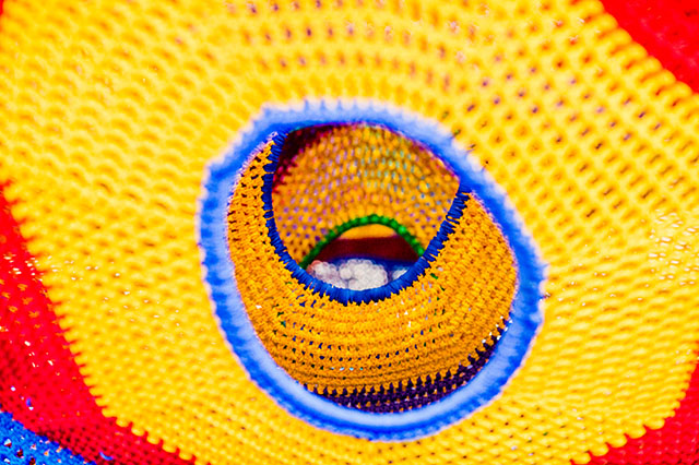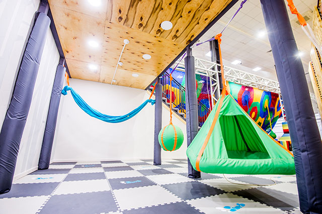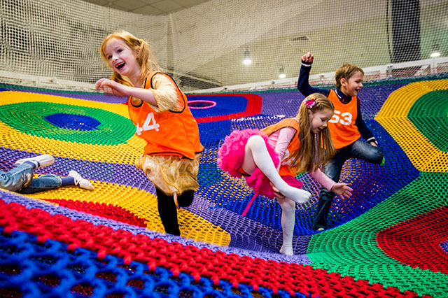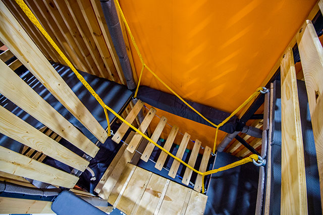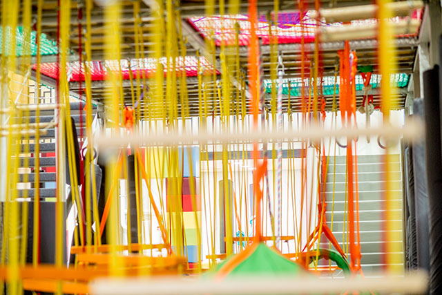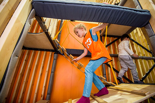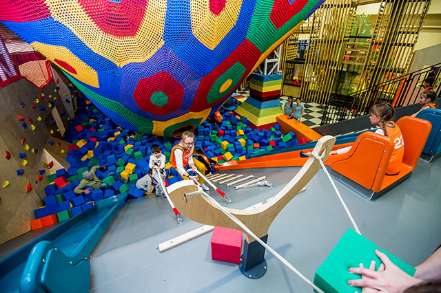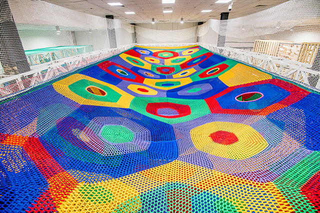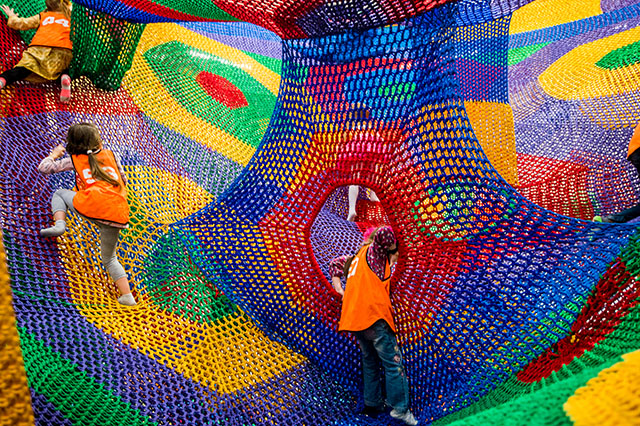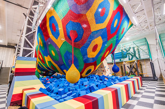 Первая крутая штука – это огромный, свисающий с потолка до самого пола, размером с добротный коттедж, вязанный вручную местными вязальщицами (это реально так!) кокон-лабиринт. Это вязаный космос. Ты залазишь в дырку, и перед тобой открывается 4-х уровневая паутина высотой в несколько метров. Нет никаких перил, ступенек и ручек, ты цепляешься пальцами за крупные петли, упираешься ногами в стенку и карабкаешься наверх, пролазишь через круглый лаз, оказываешься на следующем «этаже». Мира оттуда выходить не хотела, сказала, что хочет там теперь жить. Кросс-фит отдыхает, это реальная прокачка мышц всего тела – от макушки до пяток. Но того, кто выкарабкается на крышу, ждёт ещё один восторг. Крыша представляет собой то же вязаное полотно, на котором можно лежать, как в гамаке, можно бегать, как по облаку (мечта всех нормальных детей!), можно кувыркаться, прыгать, скатываться, как с горки. Я лично лежала, и это 100% антидепрессант! Вязаное поле моей мечты из крупных петель, или будто валяешься на огромном свитере. Представляю, что рождается в голове детей, когда они оказываются там.