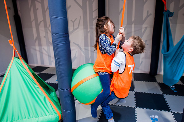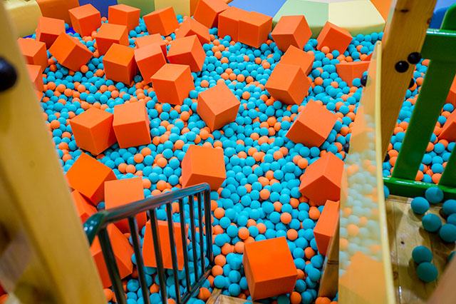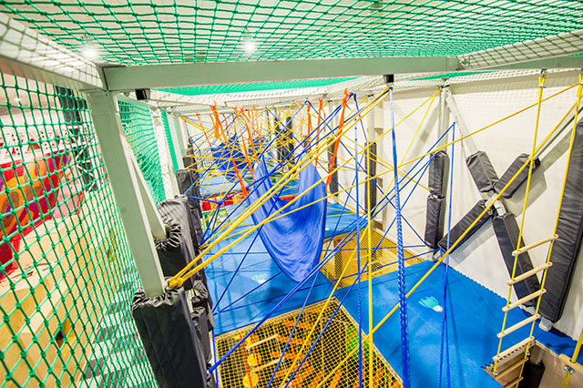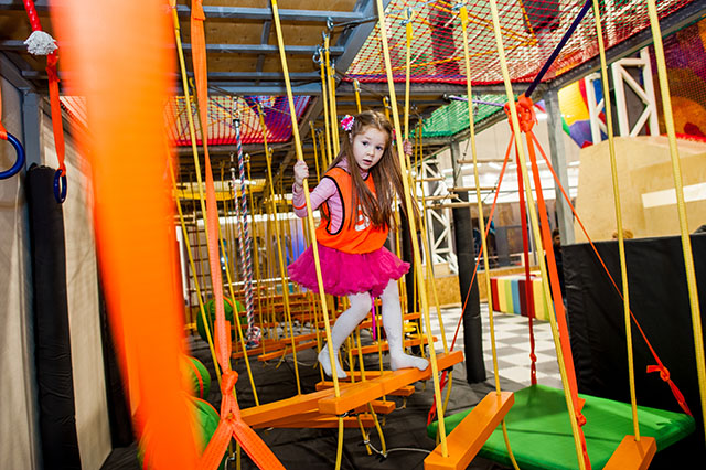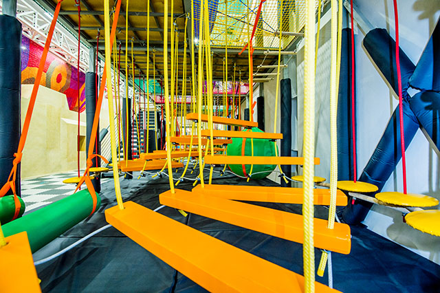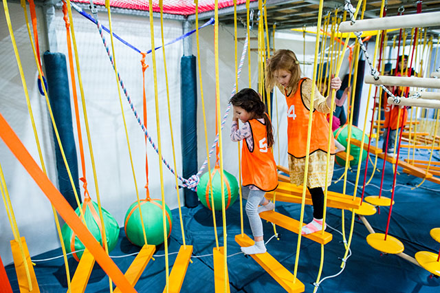 Шестая крутая штука – 2-х уровневая полоса препятствий для маленьких любителей адреналина. Это зона для активных действий, тут превосходно развивается координация, прокачиваются мышцы, просыпается инстинкт самосохранения и логика. Это полоса препятствий, состоящая из сложных штук: где-то надо перешагнуть, где-то проползти, где-то перепрыгнуть. Очень увлекательно и экстремально для всех, независимо от возраста. Цвета – синий и оранжевый. На первом уровне верёвочная лестница, которая двигается вместе с тобой, прыгалки, каталки, лазалки. Есть даже настоящий пиратский канат, по которому можно спуститься со второго этажа. Кайф же! Тут, в основном, мальчишки и девочки постарше, напоминают современных Маугли в джинсах.