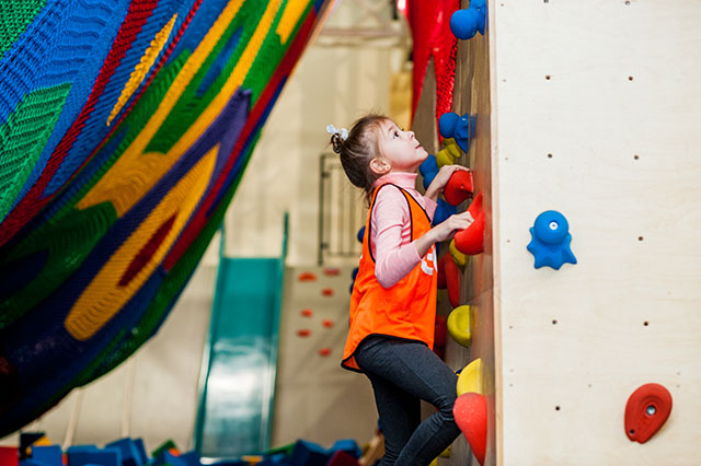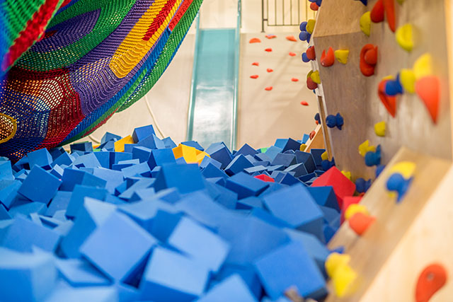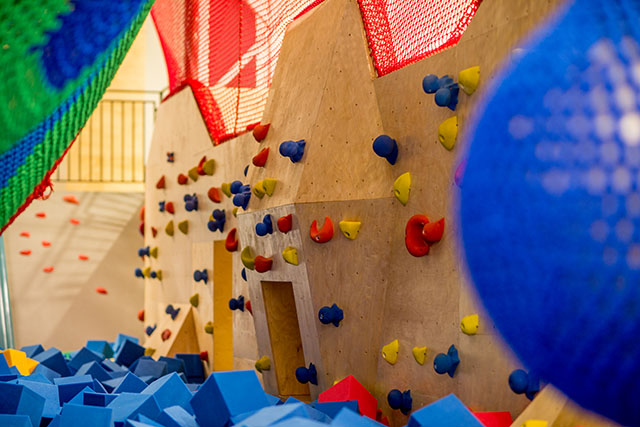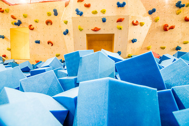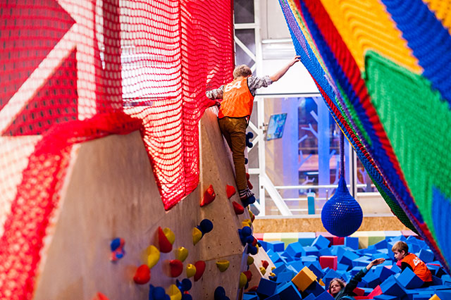 Восьмая крутая штука – собственный скалодром. Он расположен над тем же бассейном с поролоновым наполнением. Высота – несколько метров. Он больше любительский и без страховки, но совершенно безопасный и фановый. Дети карабкаются по нему и счастливые падают в поролон. Это в зоне от 6 лет и старше. Его не сразу увидишь, он скрыт за тем самым вязаным коконом, и мне кажется, что это отличная идея для разминки перед покорением 4-х уровневого вязаного чуда. Это единственная штука, которую я не тестировала лично. Если ваши дети – любители спорта и экстрима, им эта стена придется по вкусу.