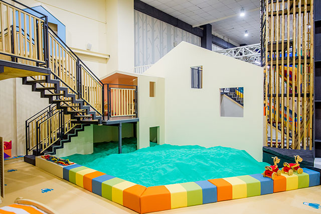 Вторая крутая штука – это просторная песочница размером с комнату, наполненная бирюзовым песком. Это как кусок океана или что-то волшебное из мира детских фантазий. Садишься на удобный широкий бортик песочницы и как будто ноги опускаешь в океан. Смотришь на цвет и успокаиваешься, вдохновляешься, наполняешься. Даже если ты просто мама. Вообще в Уфе дефицит цвета, реально необходимого для глаз и мозга, мне кажется. Почти девять месяцев серо-белые будни и маленький кусочек лето-осени. И когда видишь что-то подобное, ощущаешь, насколько проголодался по цвету. Этот нежно-бирюзовый песок облюбовали местные мамочки, я его практически каждый день встречаю в инстаграме, а дети просто сидят в нем как завороженные и перебирают своими маленькими пальчиками. Сам по себе он сухой и напоминает морские стеклышки. У дочки вообще возникло желание попробовать его на вкус. Это в зоне для малышей от 1,5 лет. В самой песочнице есть разные «крутилки», мешалки, лопатки, чтобы по-всякому можно было с этим песком возиться. Рядом построены два детских домика с увлекательным содержимым, куда также можно забираться и играть. Всё безопасно – от расположения до материалов, продумано и выверено до сантиметра. Так что родители здесь сами отдыхают, снизив степень контроля за ребёнком до минимума.