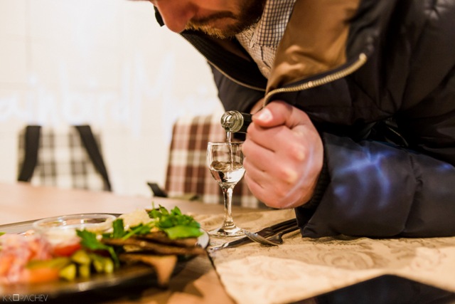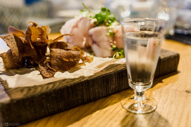 Я почти не чувствую вкуса муксуна. Попробовал больше соуса – нет, не то. Бородинские чипсы классные, но с пивом я бы их полюбил больше. Позже мне пояснили, что эта закуска экспериментальная, и ещё обсуждается, стоит ли её вводить в меню. По мне, эксперимент не удался. Возможно, эту закуску спасет тёплая водка. Кстати, употребляющим в меру – не бойтесь пить её теплой. Она тоже имеет право раскрыть свой вкус. Да, дамы, у водки есть вкус!