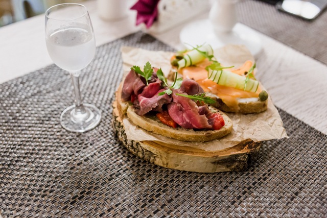 «Вино и сыр». Заведение, явно не специализирующееся на водке. Ресторан с очень уютным интерьером. Представьте: вы пришли, но вы не любитель вина. Как я. И вот, озадачиваете официанта закуской к рюмке водки. Какой ответ у винного ресторана? Брускеты. Неявная для меня закуска, специально к водке я бы их не попросил. Но они были очень вкусные – хрустящий ароматный хлеб, маленькие кусочки маринованного перца и нежное мясо. Вот только готовили эти чудо-бутерброды целых полчаса. И это при том, что посадка была от силы на треть ресторана.
