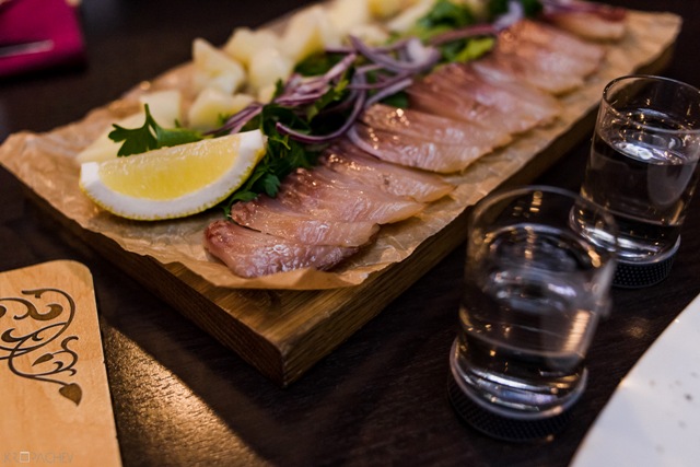 Четвёртое место – ресторан «Азык-Тулек», недавно открывшийся, но уже полюбившийся уфимцам. Немного ожидания, и мне выносят эффектное блюдо – строганина из муксуна с соусом и чипсы из бородинского хлеба. Это блюдо выглядело круче всех в моём обзоре. Отдельный респект за рюмку, она очень красивая. Мой личный фетиш – рюмки на ножке. Не люблю пить водку из стопок и шотов. Возвращаемся к закуске: выдохнул, выпил и закусил. И?
