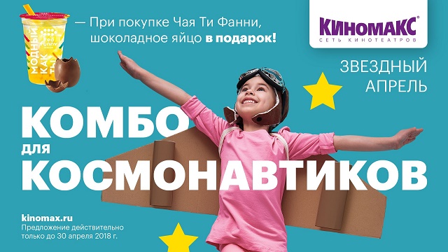 Например, в баре кинотеатра при покупке чая Ти Фанни- шоколадное яйцо в подарок. Стоимость комбо-набора составляет всего 190 рублей. «Звездный апрель» приготовил ещё много вкусных предложений, попробовать и насладиться которыми можно на месте.