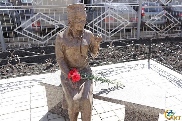 Композиция из металла представляет собой скамейку, на которой сидит женщина-доктор со стетоскопом. Ещё один элемент памятника - раскрытая книга, на странице которой написано знаменитое изречение А.П. Чехова: «Ни одна специальность не приносит порой столько моральных переживаний, как врачебная».