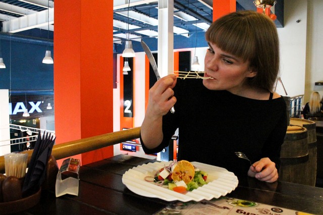 К тому времени, как отсняли весь фотоматериал, мы с фотографом Аней прилично проголодались и нетерпеливо пошли в «Гульден» – ресторан на втором этаже кинокомплекса. За что я люблю Искру, это за такие разные концепции едален, ребята подошли к ним с умом. «Шербурские зонтики» – романтика и изящество Франции в интерьере и меню, «Гульден» – основательность Германии. Не знаю, существует ли стиль «немецкое кантри», но в интерьере заведения именно он – крепкие стулья и столы, намеки на винные погреба Средневековья. Дальше ресторан японской кухни «Сёгун» – и мы к ужину до него доберемся, а также восточная кальянная «Достархан». Одним словом, национальное разнообразие под одной крышей.
