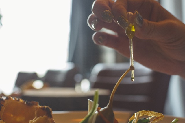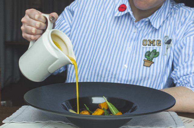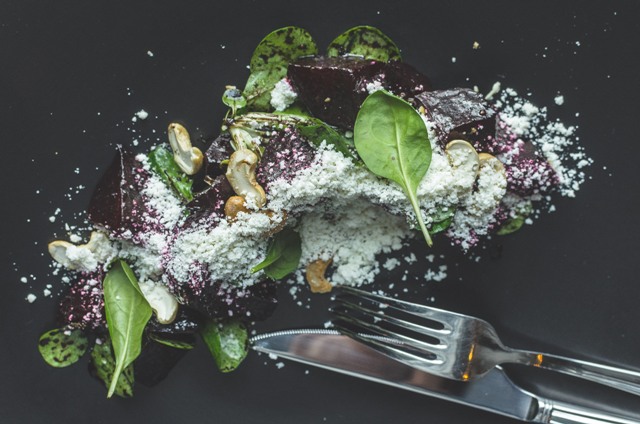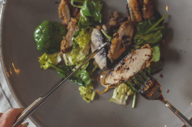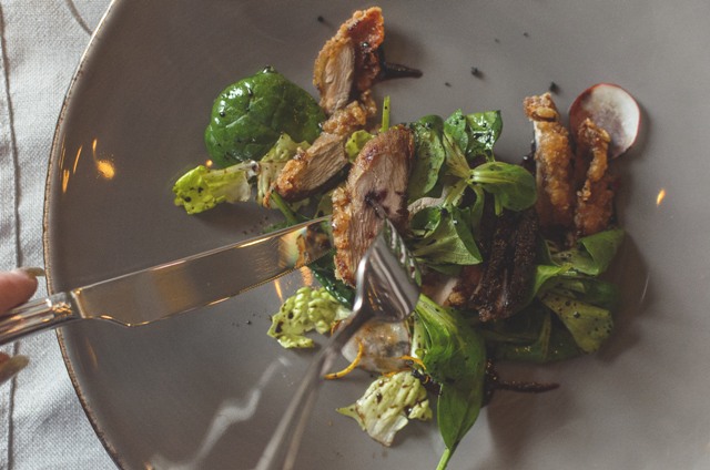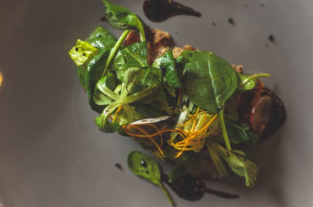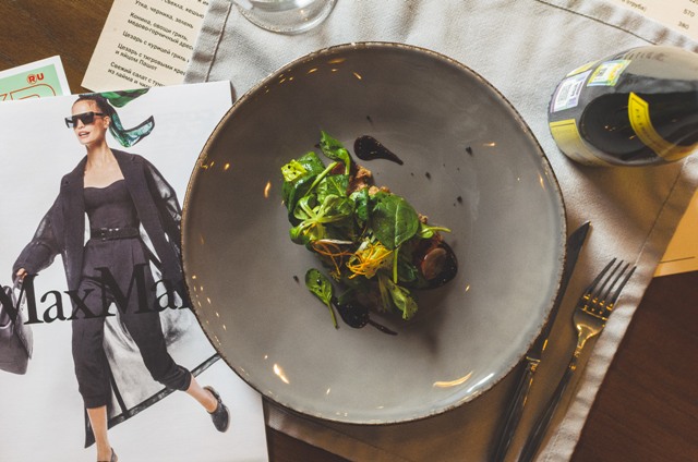Ещё один салат, который я назвала «чисто девчачий». Почему? Во-первых, в него идёт разносортная зелень «все оттенки зелёного». Во-вторых, здесь тот самый черничный соус, которым оформлены края утки в хрустящем кляре. В-третьих, перед подачей прямо на ваших глазах над вашим блюдом разбрызгивают какие-то специальные кулинарные духи с цитрусовым ароматом. Да, там прям такая специальная баночка, напоминающая спрей для лица, но это всё, разумеется, съедобно, незаменимо и очень креативно. Цитрусовый тропический запах оттеняет всё в этом салате, превращая его поедание в какую-то фантастическую историю. 420 рублей за гамму ощущений. Но та конина с овощами гриль лучше, скажу честно. Заказывайте её.