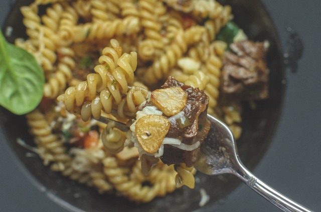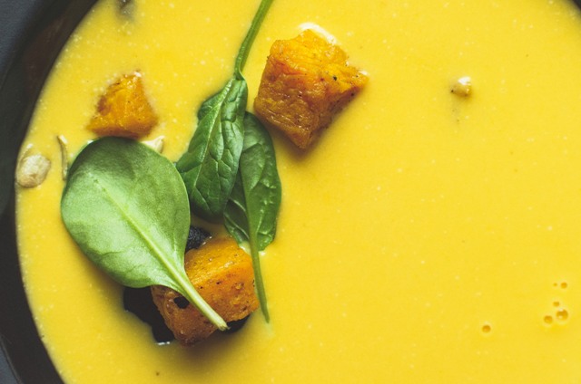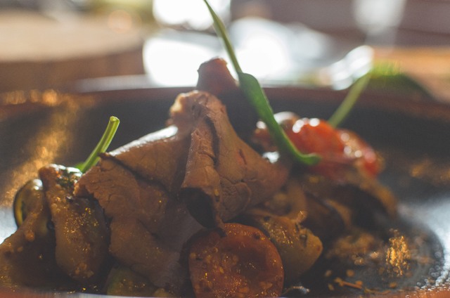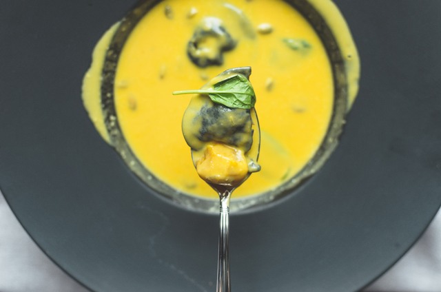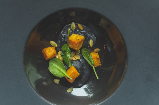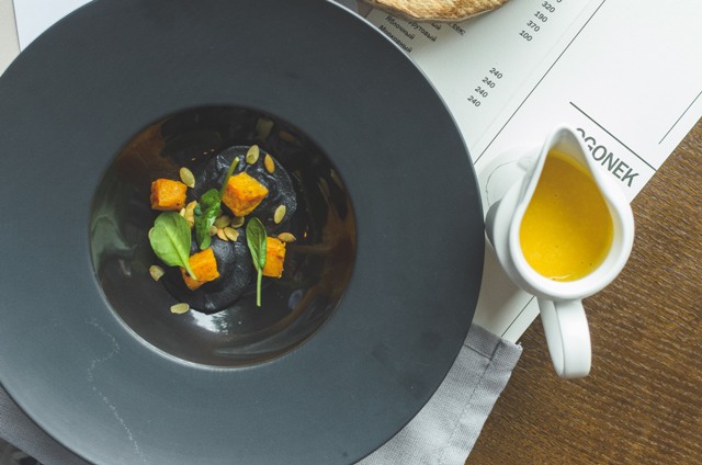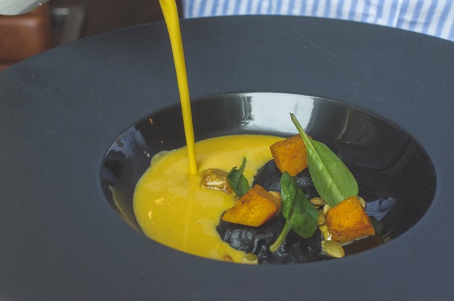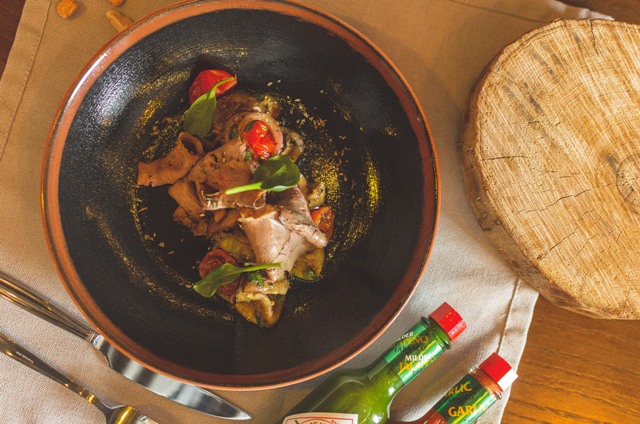 Это не блюдо, а настоящий гастрономический перфоманс для эстетов. Вам выносят большую чёрную матовую тарелку, на дне которой выложены большие чёрные равиоли и кусочки рикотты. А рядом белый кувшин, внутри которого горячая консистенция тыквенного крем-супа, доведённого до блаженства и неги – воздушный, густой, нежный и ароматный. Вы заливаете весь натюрморт тыквой, перемешиваете, даёте настояться и пропитаться всем ингредиентам и едите... Господи, как же это вкусно по-новому. Когда ты знаешь вкус всех составляющих, но вместе они дают абсолютно новое ощущение! Креветки в равиоли даже похрустывают, рикотта напоминает о мягкости блюда, а тыква как ничто согревает в последние дни февраля. Этот суп – отличная цветотерапия: вроде поел, а как в галерею современного искусства сходил, на чёрный круг Малевича посмотреть. Блюдо сытное, после него съесть второе и гарнир будет сложновато, а вот салат из той же конины с овощами – самое то!