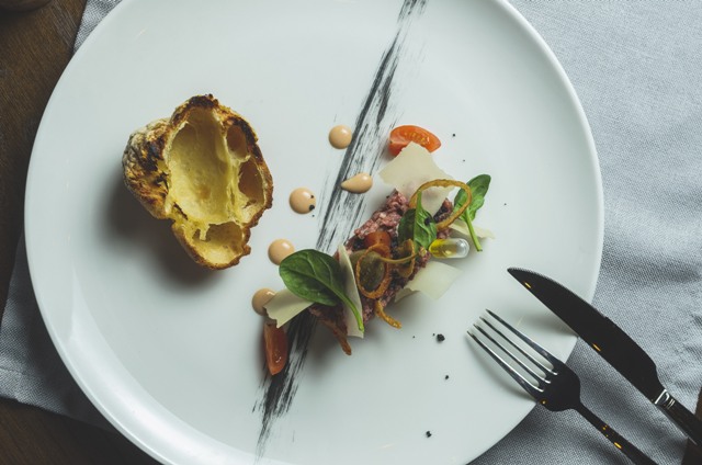 Второй «бомбой» стал тартар из говядины с черемшой и поповером. Вот эта капсула, воткнутая в тартар – это трюфельное масло, которым рекомендуется полить тартар, всё перемешать и намазать на краюшку тёплого хрустящего поповера, откусить и ммм... вознестись к небесам! Это неописуемый вкус и сочетание продуктов. Это легко и сытно одновременно, это хочется намазывать и откусывать, намазывать и откусывать снова и снова. Поповер – это своего рода корочка практически без мякиша, идеальна для таких сочных фактурных начинок как тартар. Кстати, в «Огоньке» из уважения к религиозным традициям республики совсем не подают свинину ни в каком виде – её попросту нет в меню, не было и не будет. Поэтому тартар из говядины, а в него ещё добавлена черемша (по-другому дикий чеснок или лук медвежий), благодаря чему у всего этого блюда приятный аромат, вызывающий обильное слюноотделение. Да, кстати, накануне маст ит я никогда не завтракаю, выпиваю лишь стакан воды и всё. Возможно, ещё поэтому этот тартар показался мне каким-то эталонным, идеальным и совсем без нареканий. Вот чем крута кухня лично для меня, это когда вкус в абсолютном природном балансе. Ты чувствуешь продукт таким, каким его создала природа – не вымученный специями вкус, а естественное натуральное звучание, слегка усиленное маслами, например. Вот Александру Погодаеву это удается со всеми блюдами на 100%! Кстати, порция тартар довольно внушительная, для прелюдии на романтическом свидании – то, что надо!