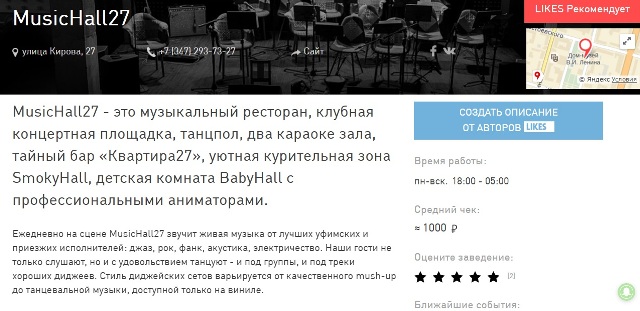 Также мы можем для вас написать эксклюзивное описание заведения в нашем фирменном стиле, это позволяет им взбираться в топ выдачи яндекса и гугла. Да, это призыв к действию.