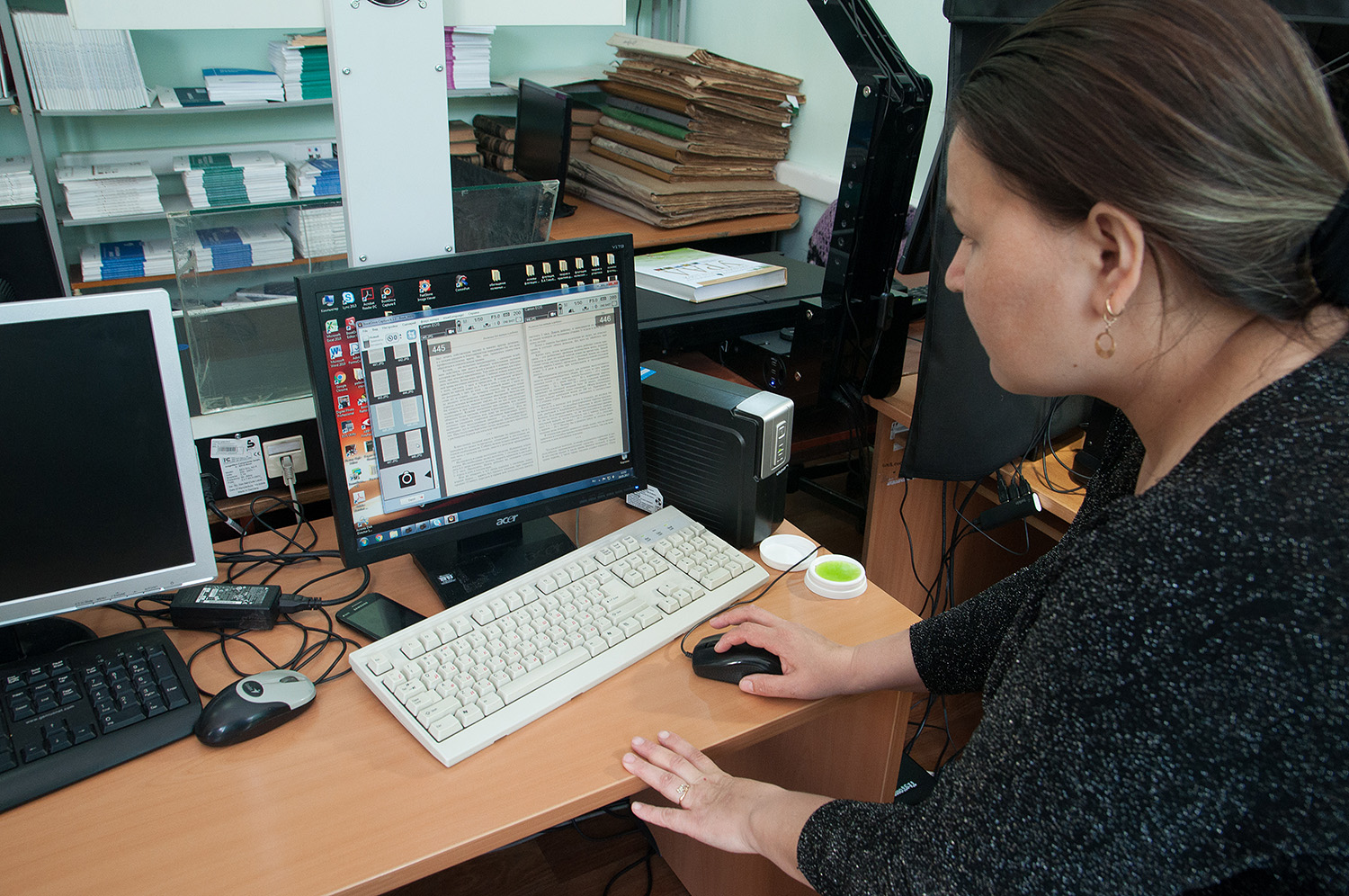 За компьютером можно читать, редактировать, распечатывать нужные документы, в том числе и полные диссертации, можно стать удаленным читателем, пользуясь услугами национальной библиотеки через аккаунт у себя дома, но нельзя перекидывать информацию на электронные носители. Два администратора пресекают любые попытки незаконного скачивания и фотографирования материалов.