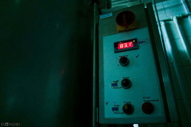 Дроблёный солод разных сортов смешивается и засыпается в большой котёл, где заливается горячей водой. Вода, кстати, обычная, водопроводная, но очищенная от хлорки специальными угольными фильтрами.